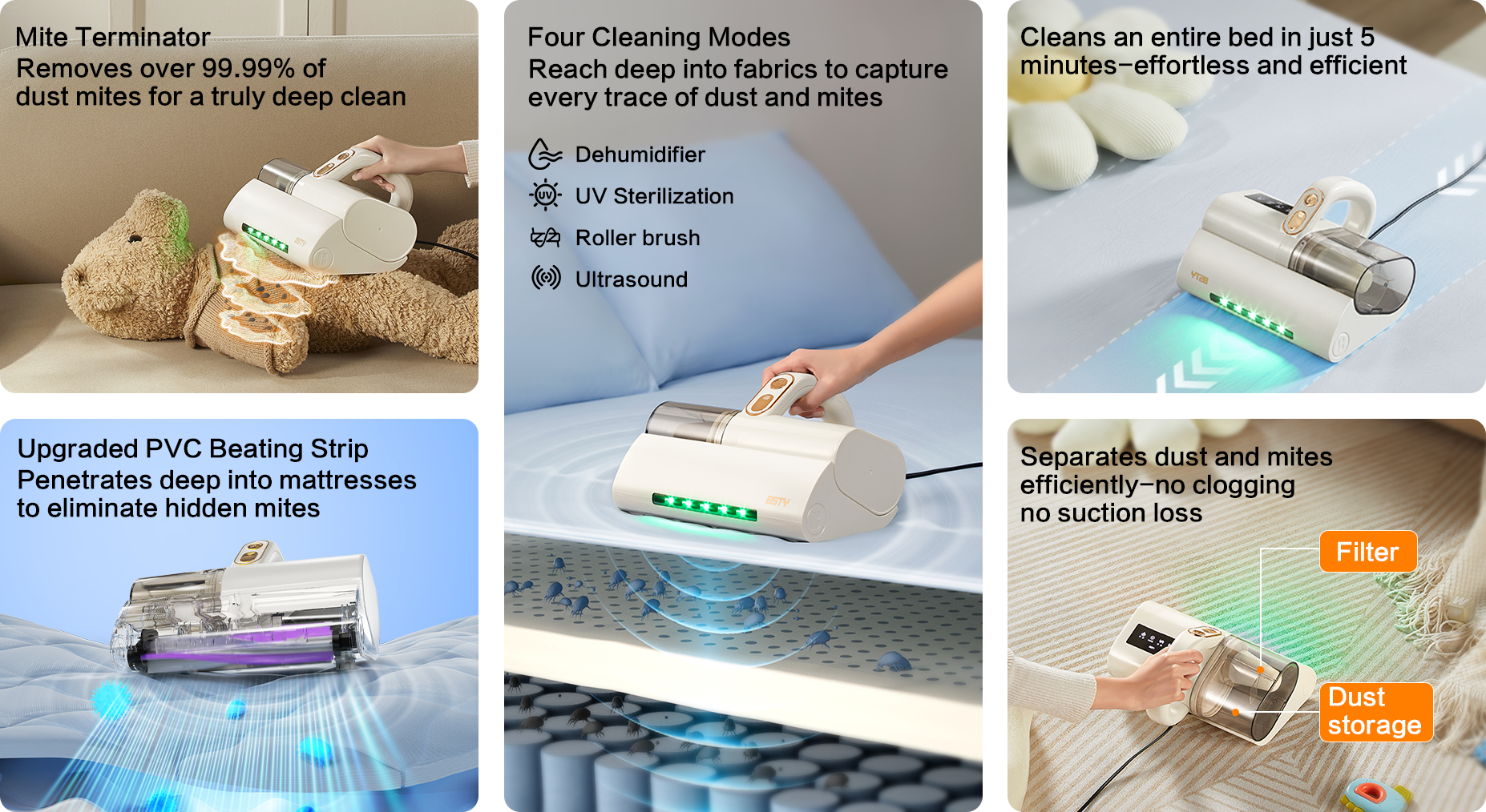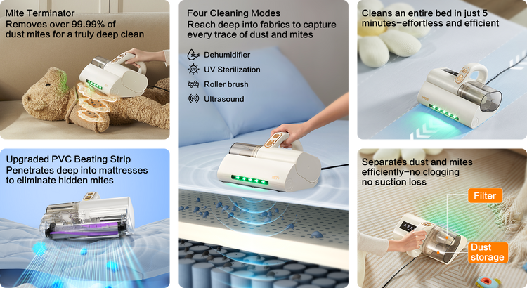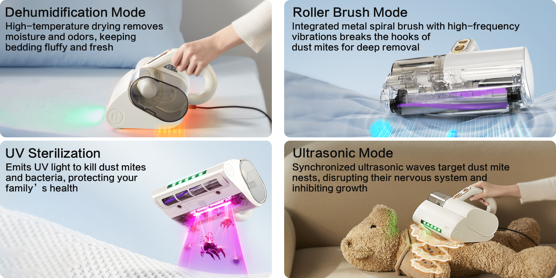 Upgraded PVC Beating Strips deliver stronger tapping to release deeply embedded dust mites, while the soft fiber brush gently removes surface mites with minimal fabric wear. Shop NowFour Powerful Cleaning Modes in One Device