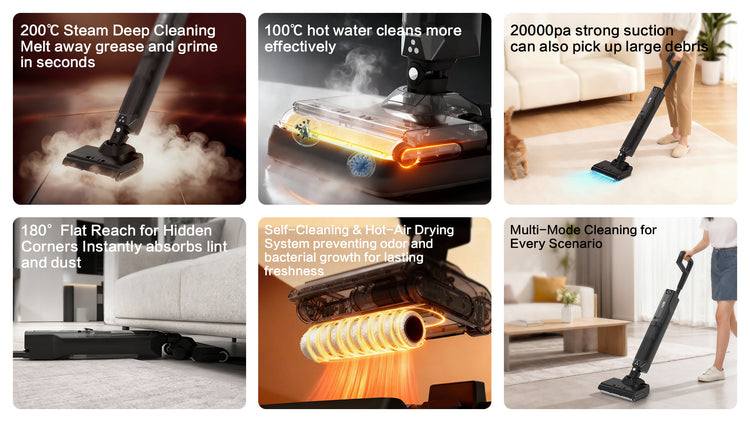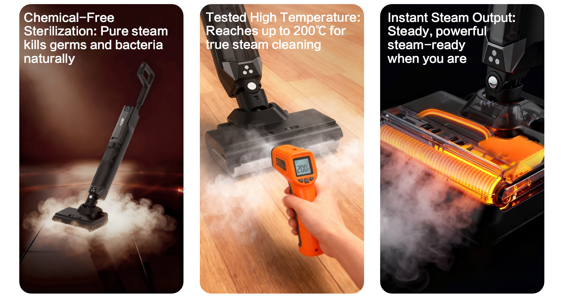 With powerful 200°C steam, it instantly melts grease, sticky stains, and tough dirt, giving your floors a deep, chemical-free clean. Perfect for homes with pets, kids, or heavy traffic areas.